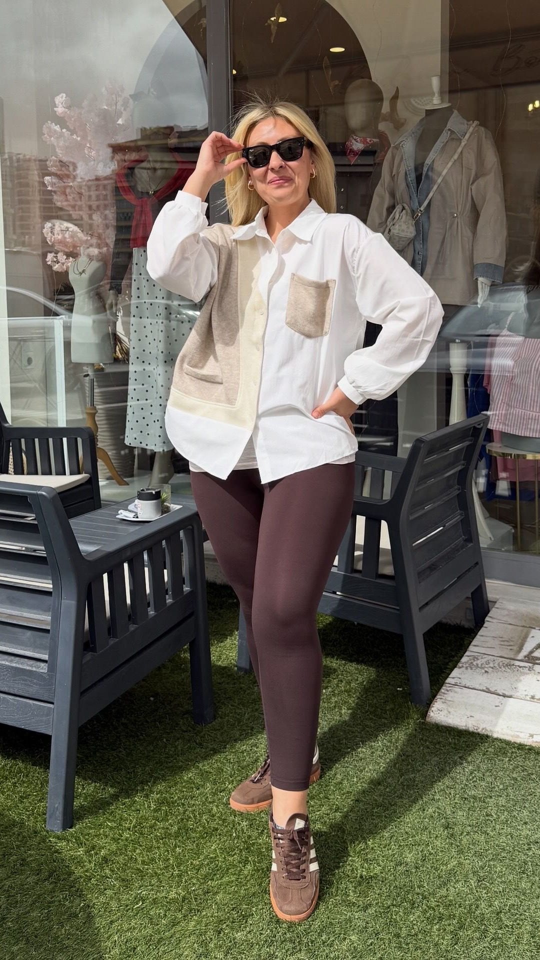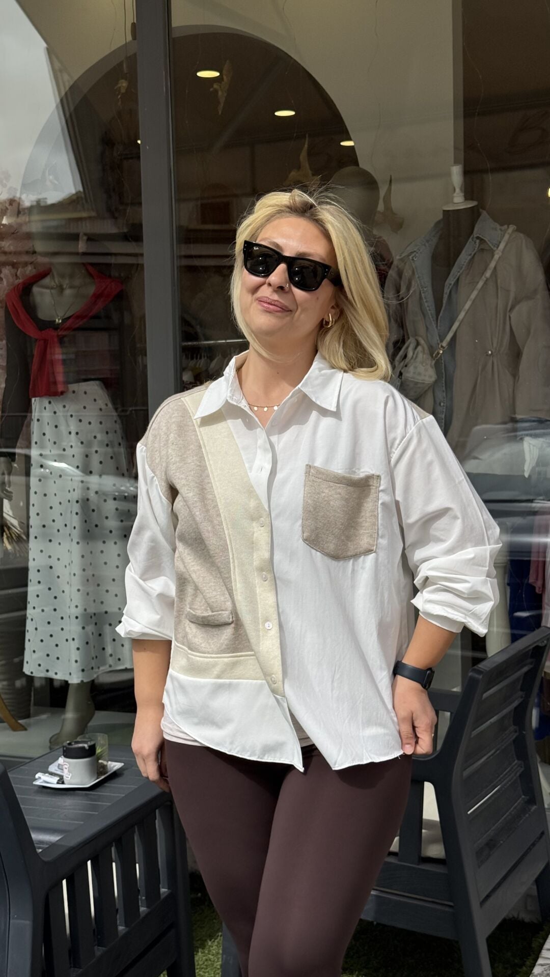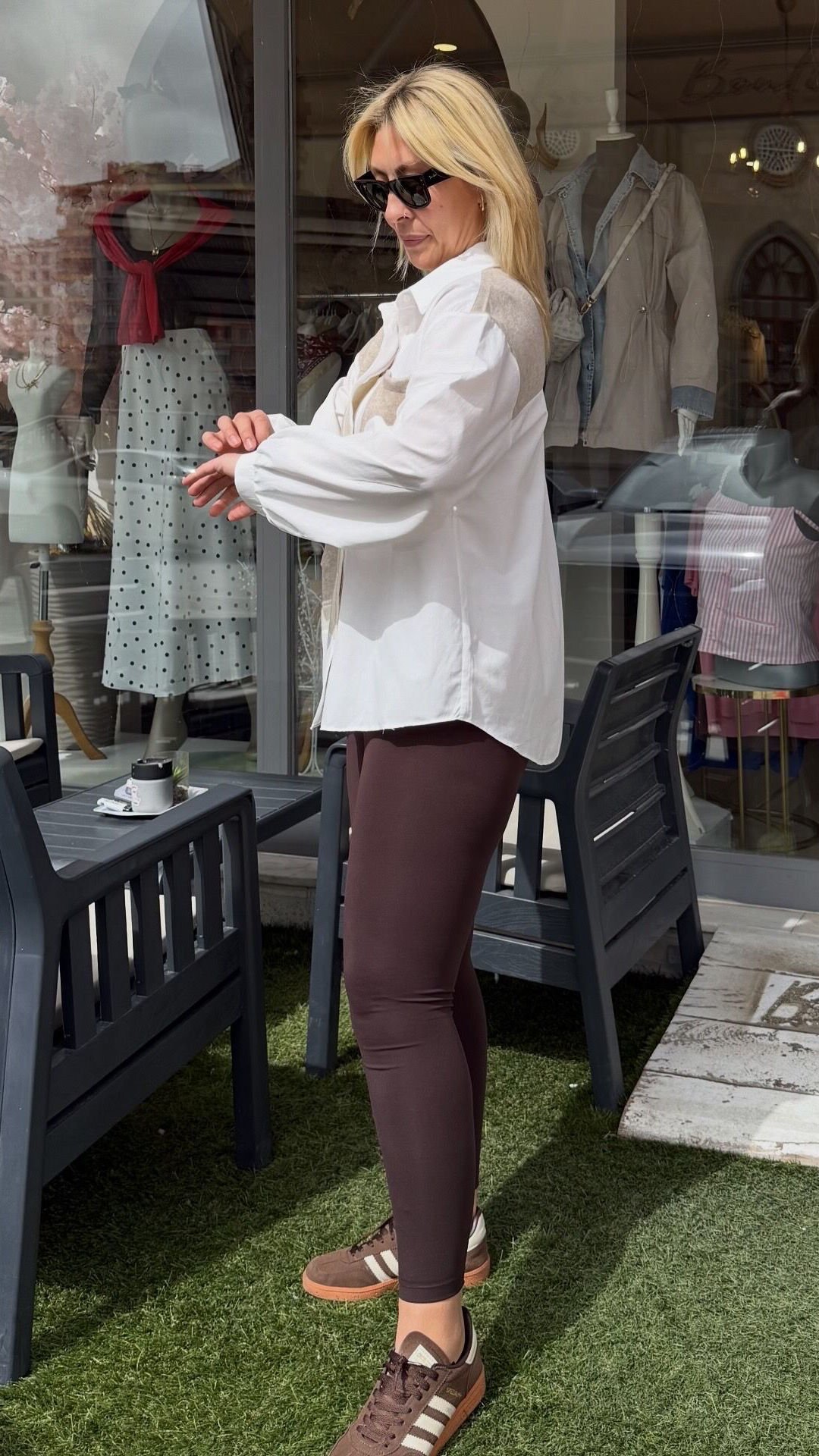 Oldukça salaş yapış koldaki hafif balon kol duruşu gömleğin tarzını ortaya koyuyor.