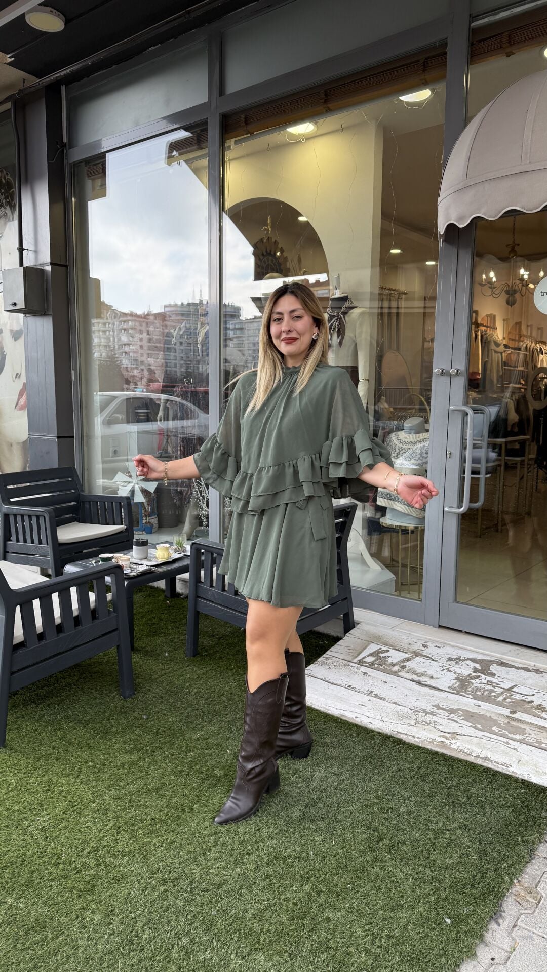 Hareket ettikçe uçuşan pelerin formu, siluetinize hafiflik ve sofistike bir duruş kazandırır.