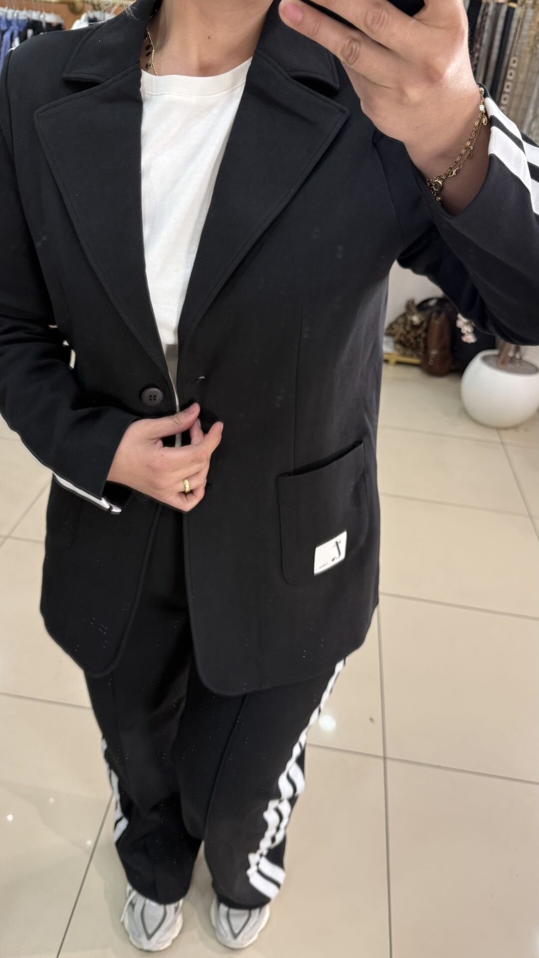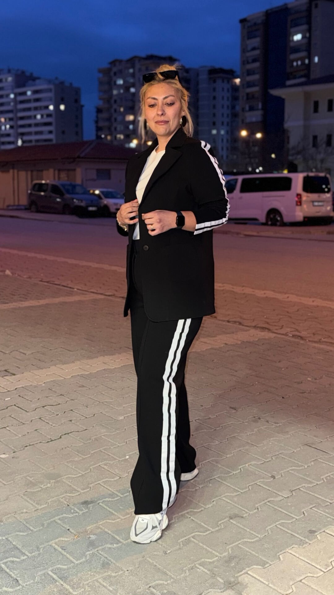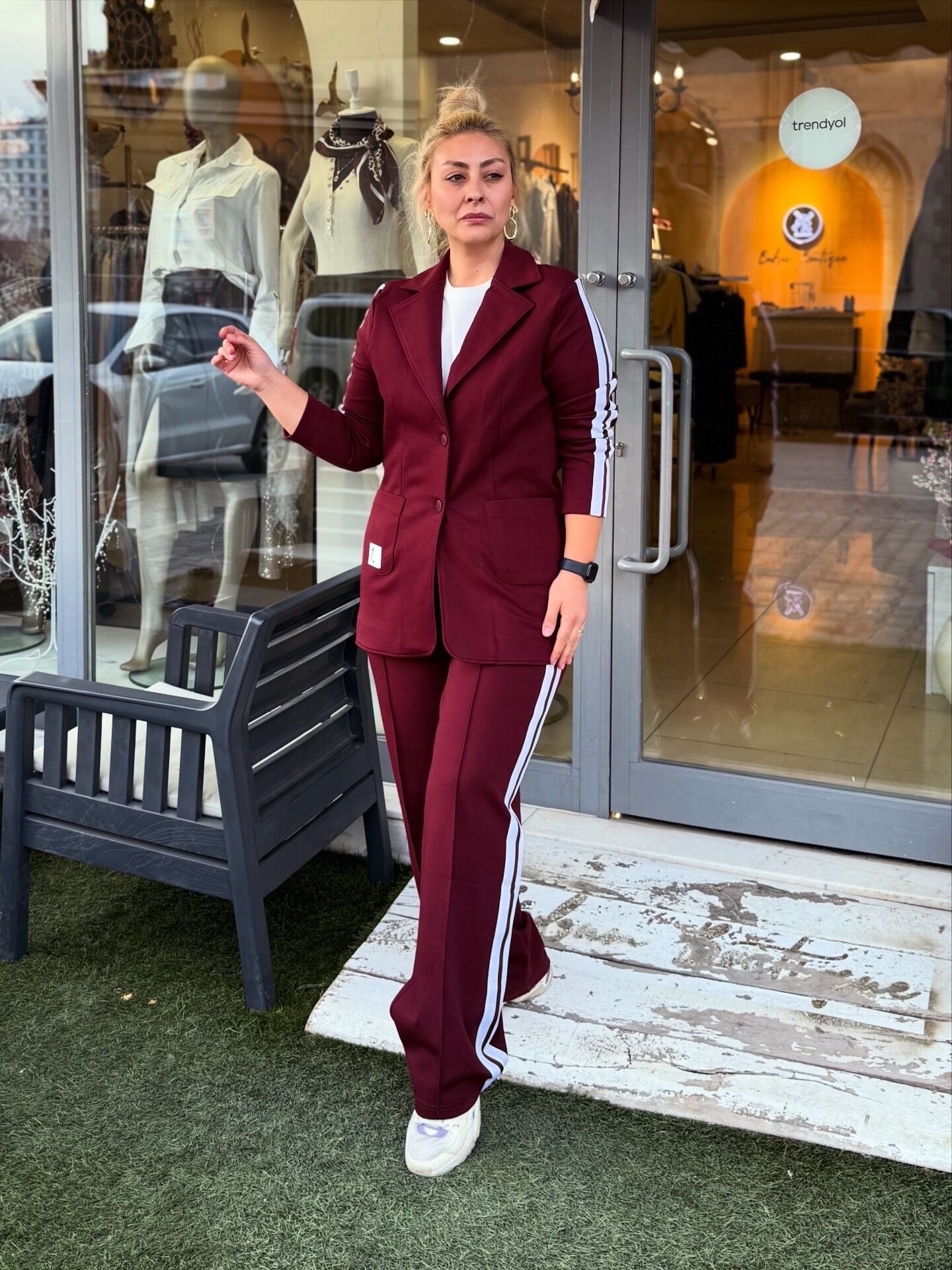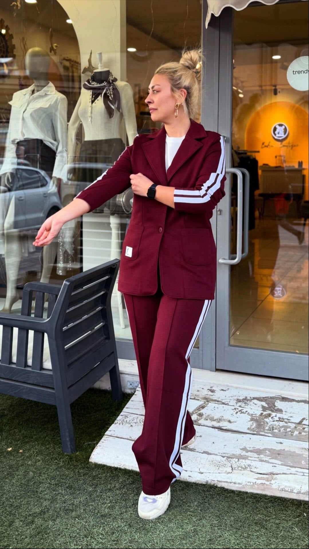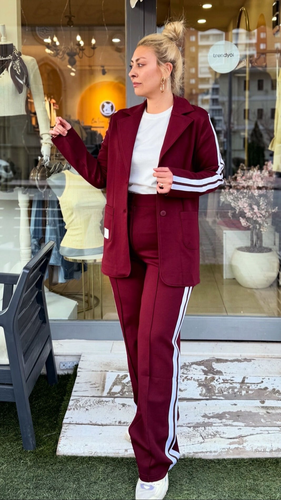 Yan Şeritli Blazer ceket ve pantolon takımımız, ceket pantolon takımını apayrı bir yere taşıdı çok sevdik esnek rahat kalıp.