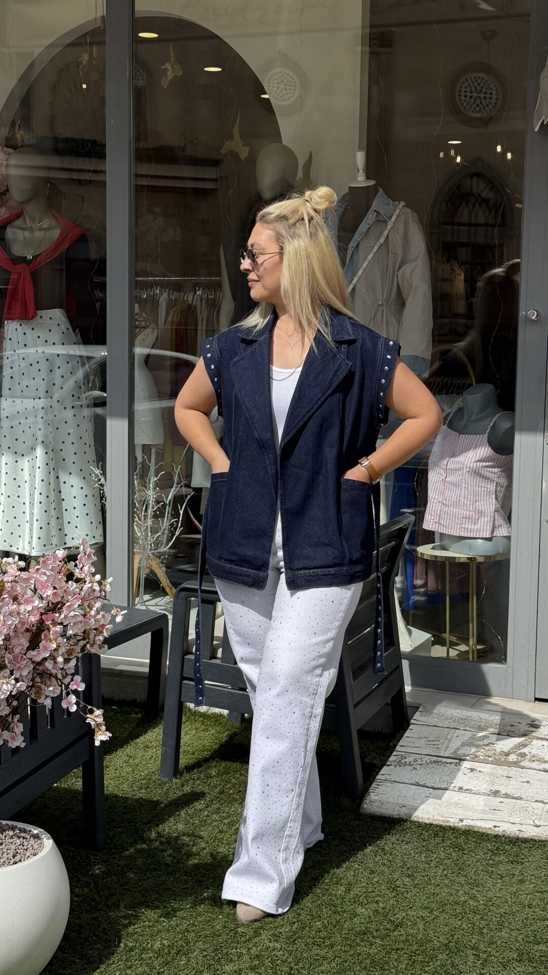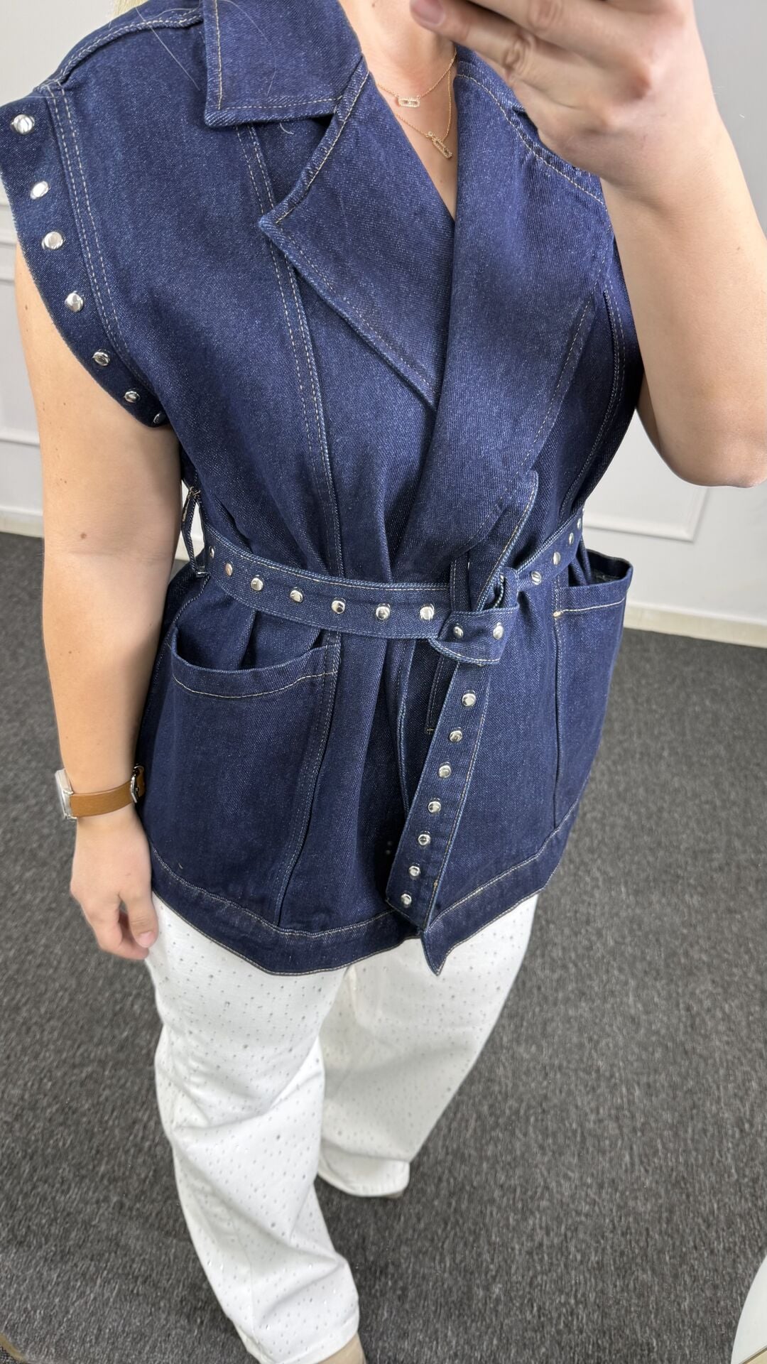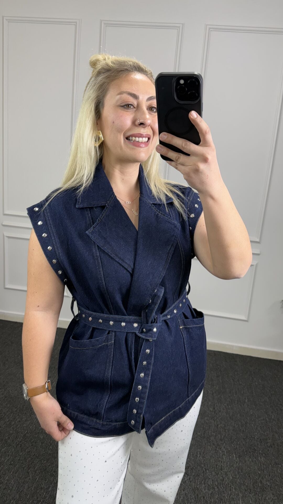 Gardırobunuza modern bir imza atın! Premium Drop çakım ve kemer detaylı denim yeleğimizle stil dozunuzu zirveye taşıyın. Koyu denim kumaşın asaletini, yakadaki, kol ağızlarındaki ve cep kenarlarındaki metal drop detaylarıyla birleştirerek cesur ve modern bir silüet yarattık.