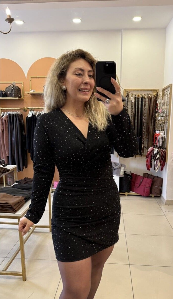 Işıltılı dokusu ve kruvaze kesimiyle feminen şıklığı ön plana çıkaran bu elbise, bel toparlayan formu sayesinde kusursuz bir siluet sunar. Esnek ve rahat kumaşıyla gün boyu konfor sağlarken, mini boyu ve zarif ışıltılarıyla özel davetlerden akşam kombinlerine kadar her ortama uyum sağlar.