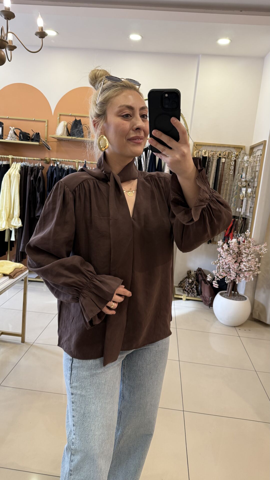 Tensel bluz, rahat kalıbı ve şık V yaka tasarımıyla günlük şıklığa yeni bir soluk getiriyor. Boyundan bağlama detayı, zarif ve modern bir görünüm sağlar. Bir beden küçük tercih edilmesi önerilir. Tam boy kesimi, her kombine kolayca uyum sağlar ve konfor sunar.